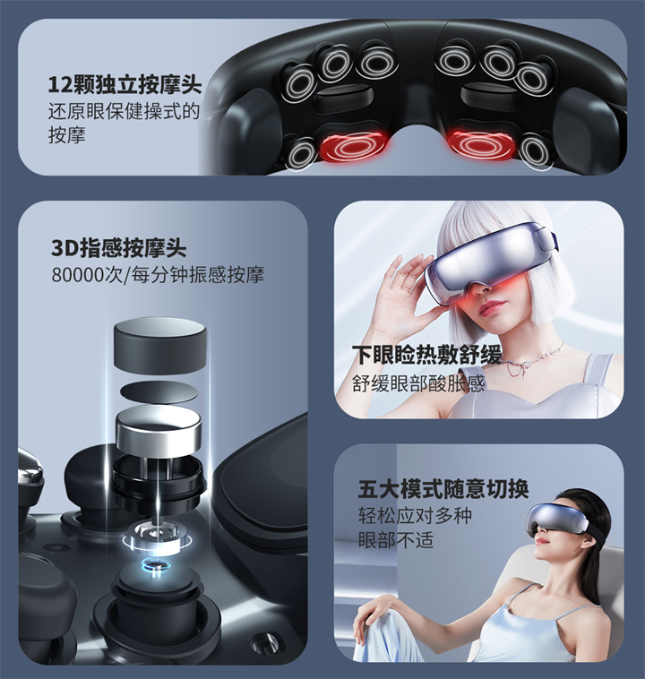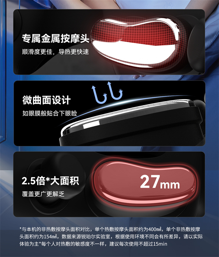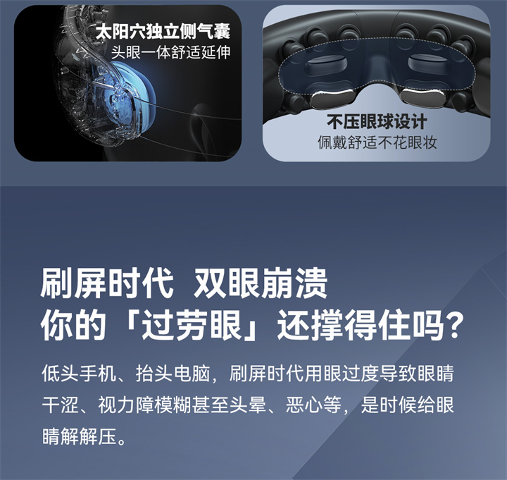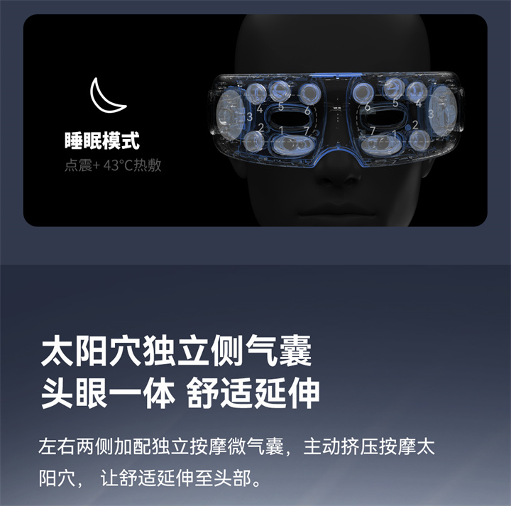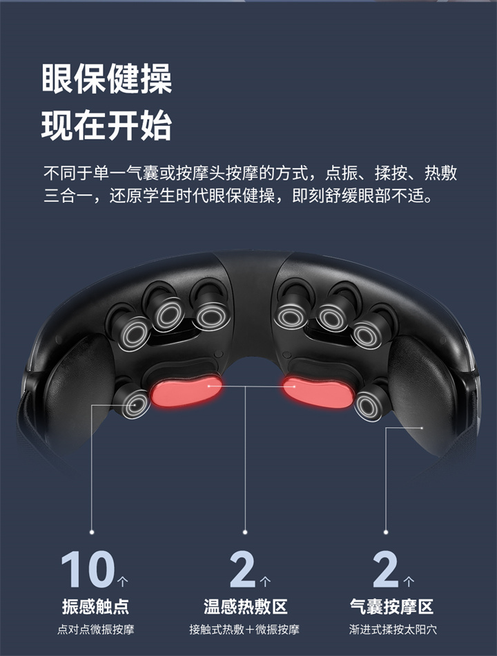 銳珀爾眼部按摩器RP-I50,根據國人眼型設計,機身弧度更貼合眼眶,貼心預留立體凹槽,保護眼球,按摩后視力不模糊,自帶應急可視窗,可舒緩全黑密閉焦慮感;內置大自然的場(chǎng)景音效,讓眼睛和心靈雙重放松,還有藍牙連接,可以隨心聽(tīng)歌、聽(tīng)書(shū)等,更多神奇功能,等待您親自試戴發(fā)現……