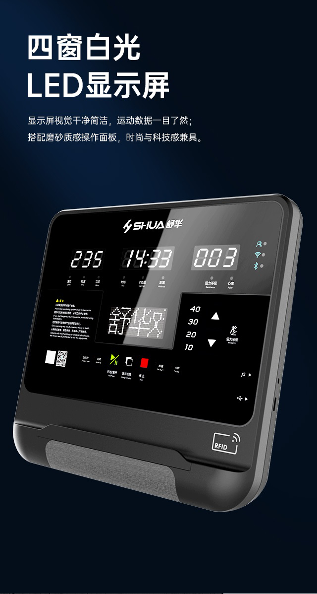 舒華高端跑步機SH-T9100T(V10+)擁有超大高清32寸10點(diǎn)觸控晶屏的工業(yè)屏,具有掃碼、刷卡、人臉識別等多種智能登錄方式,方便快捷,并且有在線(xiàn)教學(xué)、專(zhuān)業(yè)健身模式隨意切換,讓您開(kāi)啟科學(xué)健身。