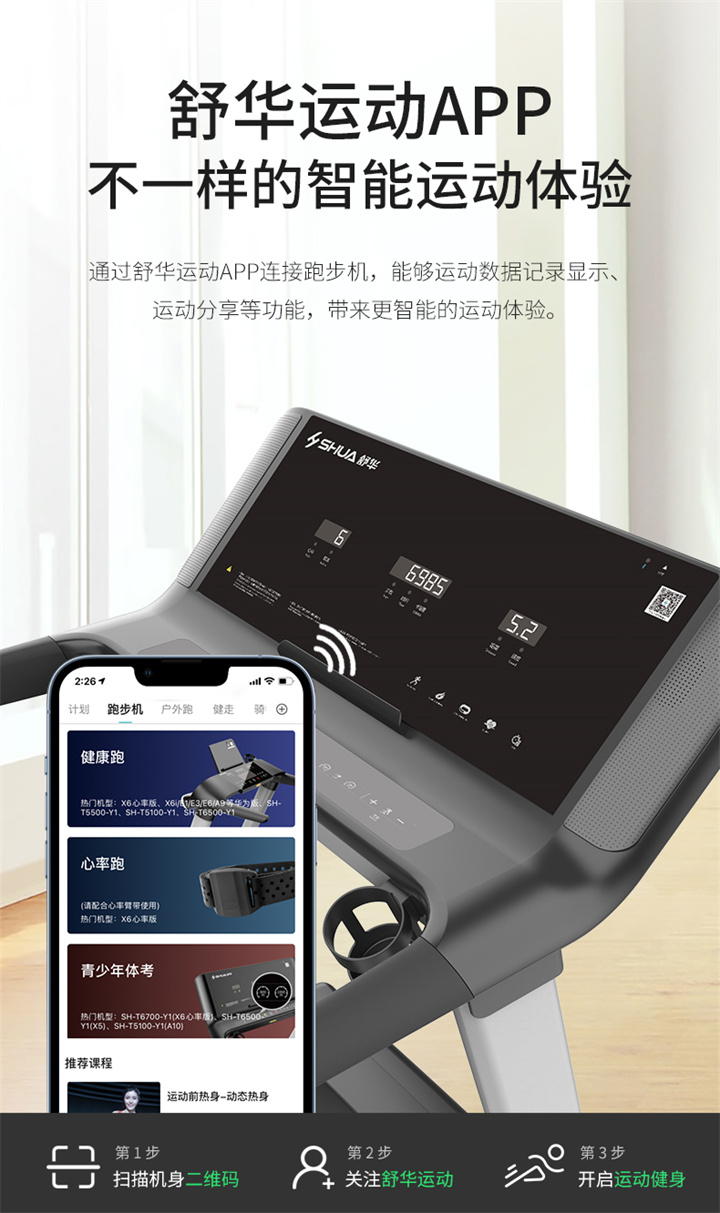舒華I5智能家用跑步機是由舒華體育聯(lián)合中國體育科學(xué)學(xué)會(huì )、上海體育大學(xué)運動(dòng)科學(xué)學(xué)院教授陸大江等權威機構、專(zhuān)家共同研發(fā)設計。獨特之處在于它結合國際科學(xué)跑步研究理論,能夠針對不同用戶(hù)進(jìn)行運動(dòng)能力測試,并根據測試結果生成因人而異的有氧運動(dòng)處方。這意味著(zhù)每個(gè)用戶(hù)都能得到一個(gè)適合自己的運動(dòng)方案,從而更好地達到運動(dòng)效果。這一創(chuàng )新技術(shù)可以確保用戶(hù)在運動(dòng)過(guò)程中能夠保持在最佳的區間狀態(tài),從而提高運動(dòng)安全性和有效性。